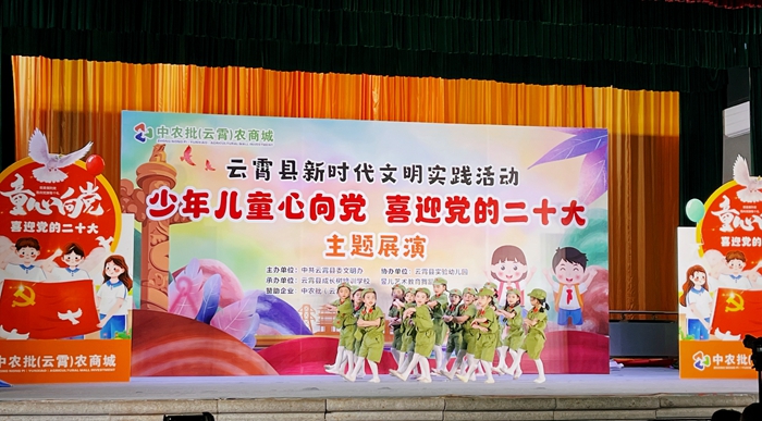 文明風7月5日訊 為引導云霄縣廣大未成年人扣好人生第一粒扣子,從小聽黨話、感黨恩、跟黨走,厚植愛黨愛國愛社會主義的情懷。近日,由云霄縣委文明辦主辦,云霄縣實驗幼兒園、中農(nóng)批(云霄)農(nóng)商城協(xié)辦,成長樹培訓學校、昱兒藝術(shù)教育舞蹈部承辦的新時代文明實踐活動“少年兒童心向黨 喜迎黨的二十大”主題展演在我縣人民大會堂舉行。