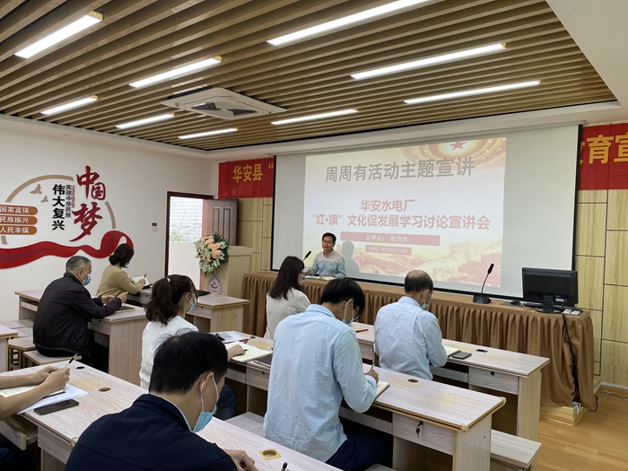 2022年05月18日, 華安水電廠在文明實踐大講堂開展“紅·旗”文化促發(fā)展學習討論宣講會。