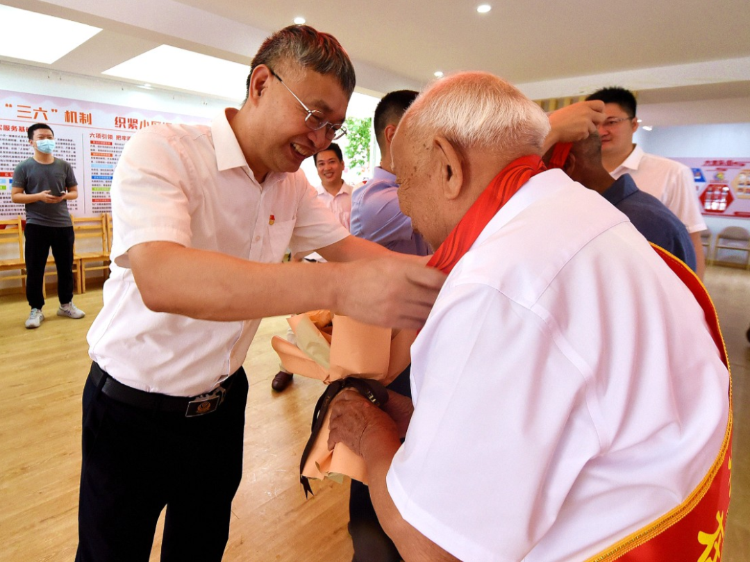 在金溪社區(qū),何必良與有著50年以上黨齡的梁樹炎、鐘清宋兩位老同志親切交談,關(guān)切詢問他們的生活和身體情況,共同回顧黨的光輝歷程,并為他們頒發(fā)佩戴“光榮在黨50年”紀念章。