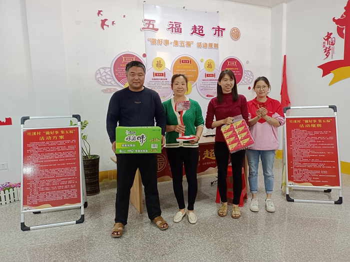 繼草洋村創(chuàng)辦“德治銀行”取得了良好成效之后,外山鄉(xiāng)延續(xù)讓德治抽象概念具體化的工作思路,結(jié)合墘溪村“?!弊执寤?,創(chuàng)辦“五福超市”,鼓勵群眾可通過做好事、參與公益活動等獲得“富強?!薄皭蹏!薄昂椭C?!薄坝焉聘!薄熬礃I(yè)?!钡摹拔甯!奔ɑ顒?,兌換日常生活用品,形成“共參與、集福卡、得實惠”的正向激勵模式,2021年來共發(fā)放“五??ā?12張,兌換物品285件。