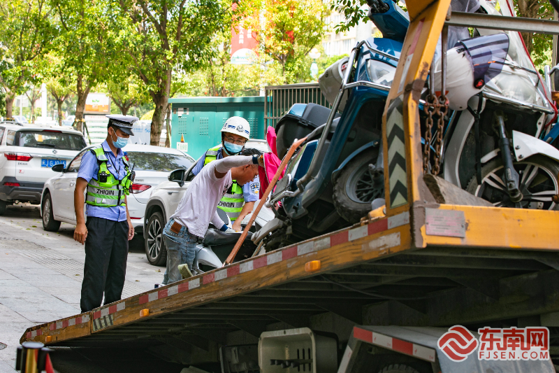 交警對(duì)現(xiàn)場(chǎng)未懸掛車牌照的電動(dòng)車依法拖離。東南網(wǎng)記者 葉伏國(guó) 攝