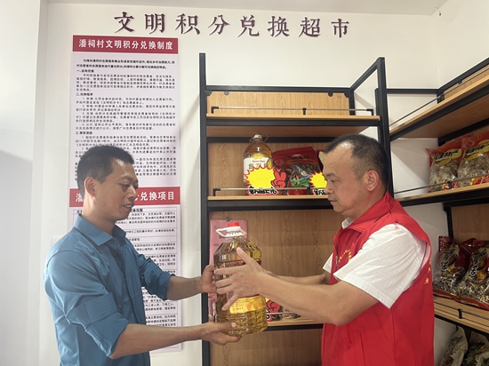 “剛好家里沒有油了,我就用‘文明積分’過來換一瓶。”近日,雷峰鎮(zhèn)潘祠村的羅阿姨,用平常幫助孤寡老人打掃衛(wèi)生賺取的積分,到村里的“文明積分超市”兌換了一瓶花生油。