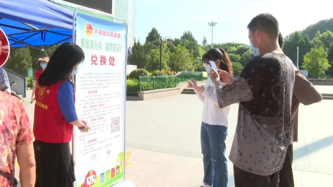 活動中,志愿者們在兌換點擺放好兌換物品,并為過往群眾介紹活動規(guī)則。群眾通過掃描關注“古田青年”微信公眾號,參加創(chuàng)城競答活動或在附近路面、草叢撿拾丟棄的垃圾后到活動兌換點進行物品兌換。