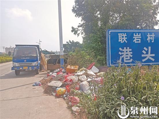 港頭路口放置著一個大型垃圾桶,桶內(nèi)空空無物,而它的旁邊,一前一后有兩堆“垃圾山”。垃圾數(shù)量龐大,有舊棉被、雜草、泡沫、塑料瓶、餐廚殘余、舊衣物、床墊、破家具、木頭、燈具等,另外還有許多用塑料袋捆扎好的垃圾,看樣子,這些都是村民扔棄的生活垃圾。據(jù)了解,這里的垃圾已經(jīng)好幾天沒人來清運。