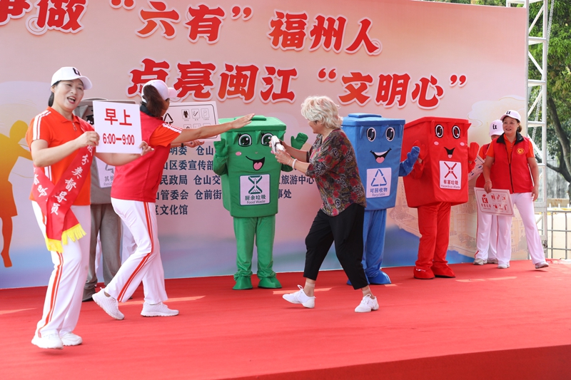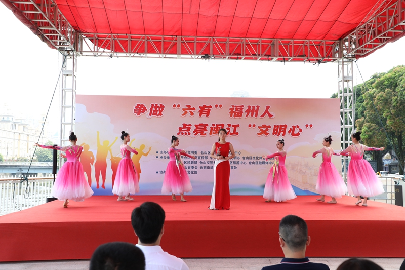 本次活動隨著開場舞《與志愿同行》拉開序幕。接著是情景劇表演《垃圾分類就是好》,在幽默詼諧的表演中倡導市民要爭做“六有”福州人,積極爭做垃圾分類的宣傳者、參與者、推動者,提升保護環(huán)境意識。隨后,倉山區(qū)文化館文化志愿者唱響志愿者之歌《世界因你而美好》,用歌聲傳遞志愿服務精神,讓廣大市民群眾深切體會到世界因為有志愿者互幫互助而更加美好?;顒蝇F(xiàn)場,福州市最美志愿者代表還宣讀了《爭做“六有”福州人倡議書》,倡導廣大市民群眾共同打造信仰堅定、崇德向善、文化厚重、和諧宜居、人民滿意的文明城市?;顒幼詈笤谖赖摹短煜赂5?最美福州》歌舞表演中落下帷幕。