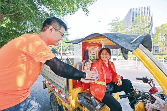 在晉江金融廣場“清涼一站”贈水點,工作人員給路過的環(huán)衛(wèi)工人遞水