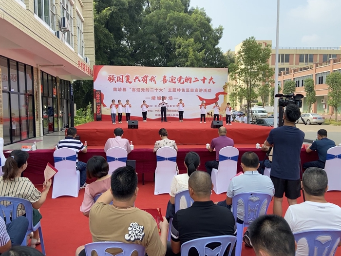 文明風(fēng)8月3日訊 為深入貫徹學(xué)習(xí)習(xí)近平新時代中國特色社會主義思想,推動黨的理論政策宣講服務(wù)走進基層,激發(fā)廣大干部群眾學(xué)習(xí)《閩山閩水物華新——習(xí)近平福建足跡》《習(xí)近平談治國理政》第四卷的熱情,近日,由南靖縣委宣傳部主辦,靖城鎮(zhèn)承辦的“強國復(fù)興有我 喜迎黨的二十大”主題特色巡回宣講活動靖城專場在靖城鎮(zhèn)舉行。南靖縣委常委、宣傳部部長沈惠平,縣委宣傳部、靖城鎮(zhèn)有關(guān)領(lǐng)導(dǎo)、各鎮(zhèn)(園)分管領(lǐng)導(dǎo)、靖城鎮(zhèn)各村居書記、代表等參加活動。