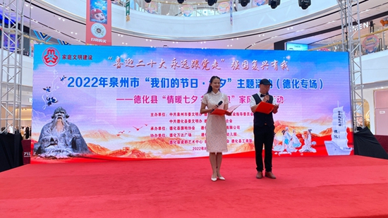 文明風8月5日訊 今年8月4日是中華民族傳統(tǒng)節(jié)日七夕節(jié),4日下午,泉州市2022年“我們的節(jié)日·七夕”主題活動德化專場舉行。市縣兩級部門有關領導嘉賓、當?shù)馗刹咳罕?、文明家庭代表歡聚一堂,共度佳節(jié),感受七夕傳統(tǒng)文化魅力。本次活動以“情暖七夕 共話家風”為主題,由泉州市委文明辦、德化縣文明委、德化縣委文明辦、德化縣婦女聯(lián)合會舉辦。