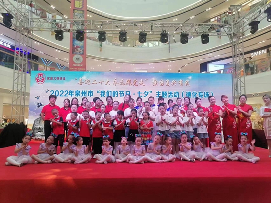 文明風(fēng)8月5日訊 今年8月4日是中華民族傳統(tǒng)節(jié)日七夕節(jié),4日下午,泉州市2022年“我們的節(jié)日·七夕”主題活動(dòng)德化專(zhuān)場(chǎng)舉行。市縣兩級(jí)部門(mén)有關(guān)領(lǐng)導(dǎo)嘉賓、當(dāng)?shù)馗刹咳罕?、文明家庭代表歡聚一堂,共度佳節(jié),感受七夕傳統(tǒng)文化魅力。本次活動(dòng)以“情暖七夕 共話家風(fēng)”為主題,由泉州市委文明辦、德化縣文明委、德化縣委文明辦、德化縣婦女聯(lián)合會(huì)舉辦。