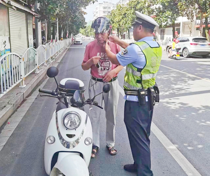 “請靠邊停一下,戴好頭盔,安全出行。”伴隨著一聲哨響,摩托車主??柯愤?,在交警的勸導(dǎo)下戴上頭盔才重新出發(fā)。