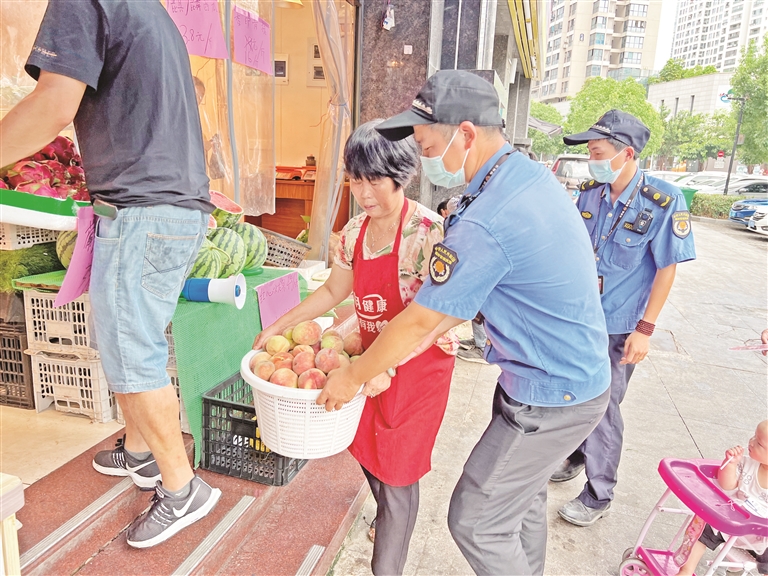 執(zhí)法人員柔性執(zhí)法,幫助小攤販規(guī)范門前經(jīng)營。張穎珍 攝