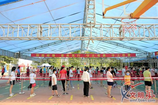 在志愿者的有序引導下,各個采樣點隊伍間隔有距、流動順暢。(翔安區(qū)委文明辦供圖)