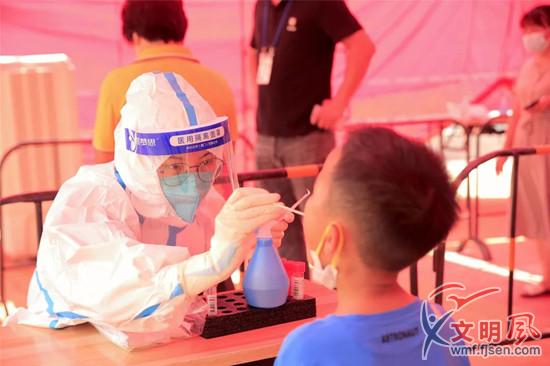 文明風8月15日訊 連日來,在廈門市翔安區(qū)核酸檢測點,醫(yī)護人員、社區(qū)工作者、黨員干部、志愿者冒著高溫,一絲不茍地為居民開展核酸檢測,天使白、志愿紅、守護藍,匯聚出了一道道讓群眾安心的抗疫“彩虹”。