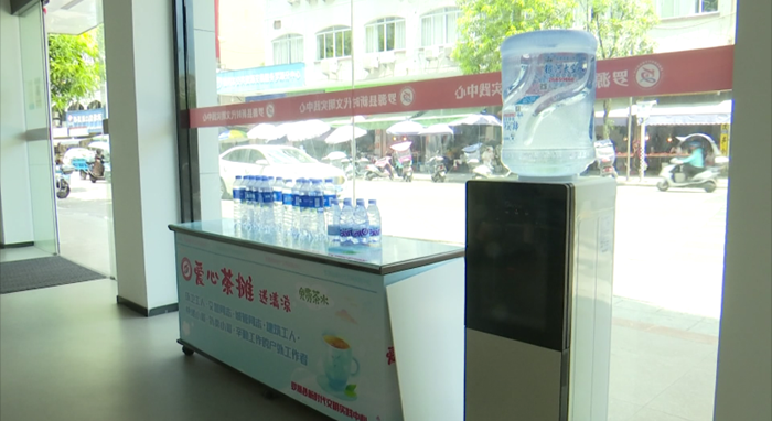 在縣新時(shí)代文明實(shí)踐中心內(nèi),室內(nèi)已經(jīng)設(shè)立了愛心茶攤,為消防員、志愿者、環(huán)衛(wèi)工人等一線高溫工作者以及過往市民提供免費(fèi)飲用水。茶攤雖小,卻愛心滿滿,吸引了不少人前來消暑解渴,得到了市民群眾的點(diǎn)贊。