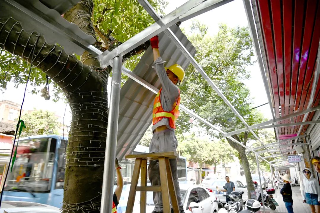 “原先一些商戶的雨披因?yàn)槟昃美匣粌H不美觀,有些還會漏水,所以借著這次雨披改造項(xiàng)目,我們統(tǒng)一進(jìn)行更換,讓街道看起來更加美觀和整齊?!爆F(xiàn)場負(fù)責(zé)人鐘慶華說。