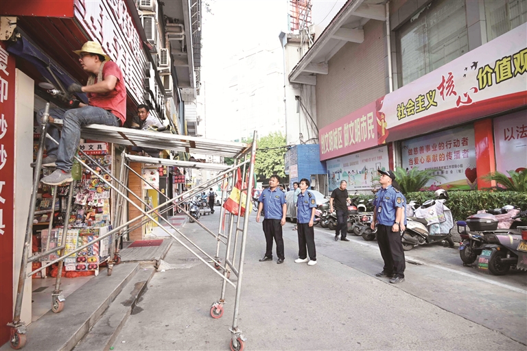 在時(shí)代廣場(chǎng),工人們?cè)谟昱路娇焖俅詈锰菁?,根?jù)不同部位,采取相應(yīng)工具對(duì)金屬架和篷頂展開拆除工作。同時(shí),執(zhí)法人員還為沿途商戶普及相關(guān)法律知識(shí),勸導(dǎo)他們要自覺遵守相關(guān)規(guī)定,不得占道經(jīng)營(yíng),保持店前整潔有序。