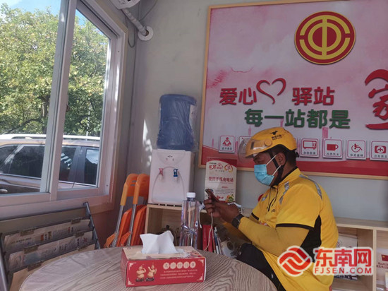 外賣小哥在“暖新鯉”驛站給手機(jī)充電。東南網(wǎng)記者 施遠(yuǎn)圻 攝