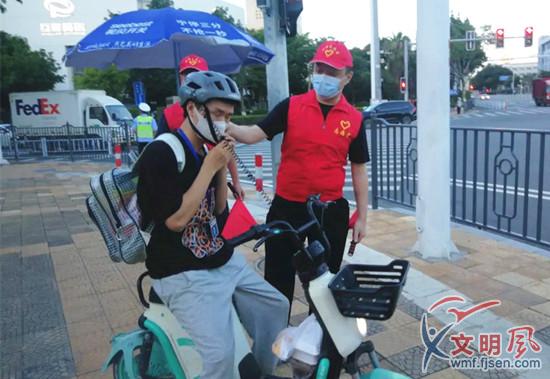 文明風(fēng)8月30日訊 “等紅燈不能越線,頭盔的卡扣要系好?!薄艾F(xiàn)在是紅燈,您還不可以過馬路,請(qǐng)?jiān)俚纫坏?!”最近,在廈門翔安街頭,每逢早晚高峰,都會(huì)出現(xiàn)一抹亮眼的志愿紅。他們身穿志愿者服裝,手持小紅旗,勸導(dǎo)市民遵守交通規(guī)則,引導(dǎo)安全出行。