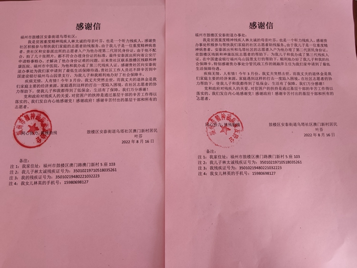 “父親過世以后,留下智力殘疾的弟弟和年邁多病的母親,生活的重?fù)?dān)一下壓在我的身上,在我焦頭爛額之際,是街道和社區(qū)主動伸出了援助之手,帶著我挺過了這個難關(guān)?!贝磺袎m埃落定,林先生及其家人的生活逐漸步入了正軌,為感謝街道及社區(qū)熱情幫扶,林先生的姐姐找到了她的鄰居——社區(qū)盲人志愿者,希望他能幫助文化程度不高的自己給街道及社區(qū)寫一封感謝信。