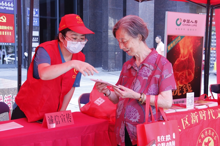 志愿者向群眾宣傳誠(chéng)信知識(shí)(長(zhǎng)樂(lè)區(qū)委文明辦供圖)