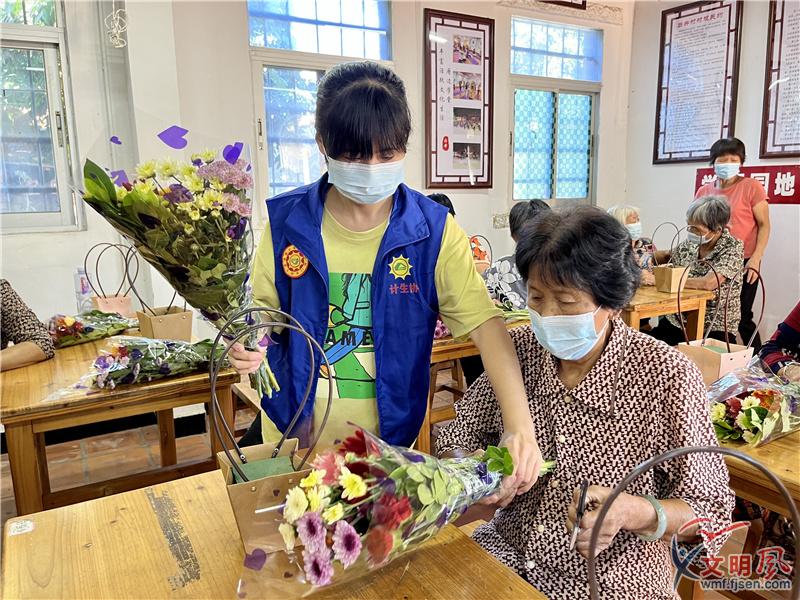 活動(dòng)現(xiàn)場(chǎng),花香四溢、滿室芬芳。志愿者從每支花的裁剪、花與葉的搭配、花與花的錯(cuò)落排序等方面,講解示范,學(xué)員們跟著志愿者一步一步擺弄手里的鮮花。經(jīng)過一個(gè)多小時(shí)的精心制作,一個(gè)個(gè)花籃逐漸成形,大家看著自己的作品,都充滿了成就感和喜悅感。