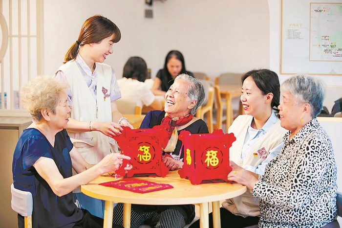 圖為老年人和社區(qū)工作者一起制作“福”字花燈。