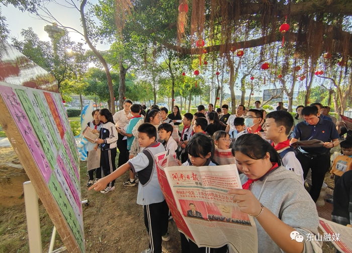 在宣講活動燈謎競猜區(qū),以黨的二十大報告中的關(guān)鍵詞和熱點(diǎn)話題為主要內(nèi)容的20多條燈謎,吸引了不少村民和學(xué)生們駐足競猜。大家或互相探討,或翻閱黨的二十大報告相關(guān)知識點(diǎn),現(xiàn)場成了學(xué)習(xí)黨的二十大精神的生動課堂。