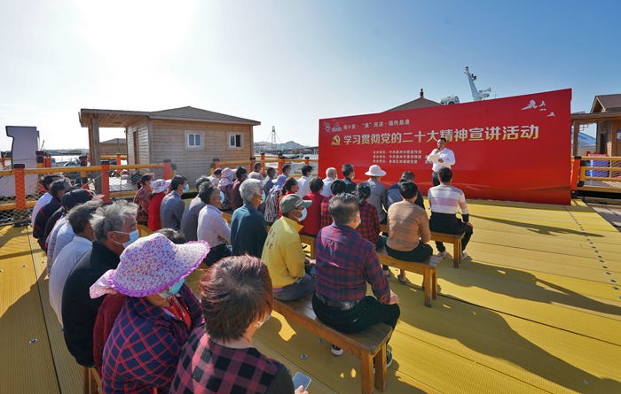 當天下午,在開往惠嶼島的輪渡上,“福小宣?‘泉’民講”宣講員、市委講師團童婷香面向渡輪乘客們,用通俗易懂的語言,宣講黨的二十大精神。與此同時,在碧波蕩漾的漁排上,惠嶼村黨支部書記、村委會主任肖清林結合海島巨變,運用方言向漁排漁民們進行“微宣講”。
