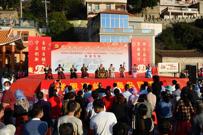活動以“黨恩惠嶼 海島巨變”為主題,開展微宣講上輪渡上漁排、“三下鄉(xiāng)”集中服務活動、文藝演出等形式多樣的活動,以群眾喜聞樂見的形式,為海島漁民送上精神文化大餐?;顒蝇F場還為“泉港區(qū)新時代文明實踐島”揭牌、為“喜迎二十大 最美二十景”短視頻征集大賽獲獎者代表頒獎,為泉港區(qū)學習貫徹黨的二十大精神宣講小分隊授旗儀式。