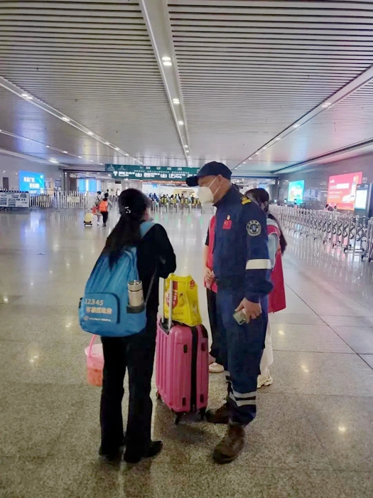 余建明(右一)在福州火車站引導(dǎo)旅客。圖片來源:晉安微文明