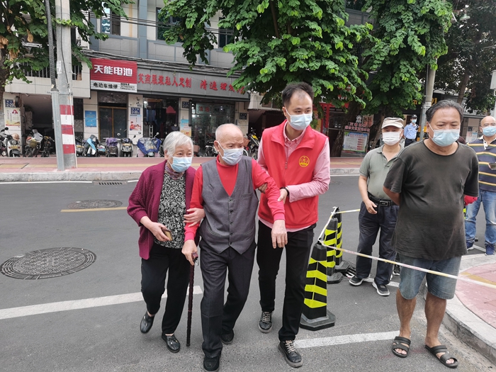 10月26日,倉前街道萬春社區(qū)志愿者協(xié)助行動不便老人前往核酸檢測(倉前街道供圖)