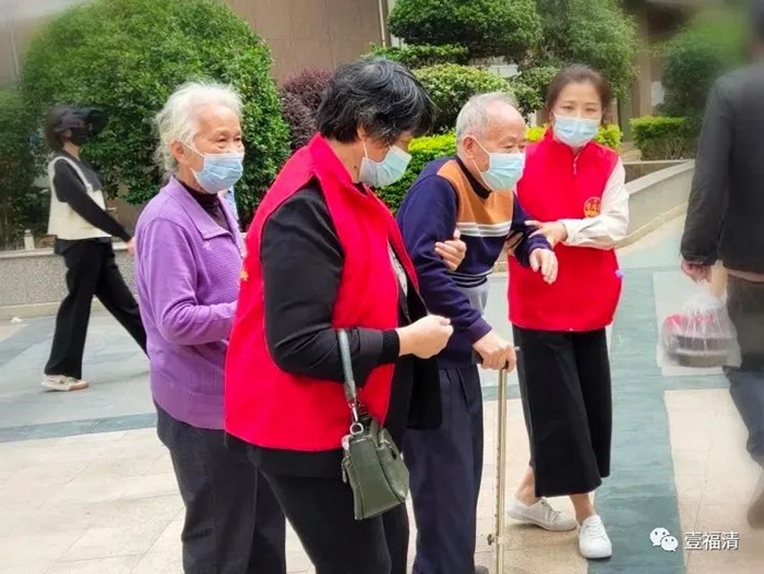 老黨員志愿者鄭瑞欽攙扶腿腳不便的老人排隊(duì),幫助老人順利完成核酸采樣。 圖源:壹福清