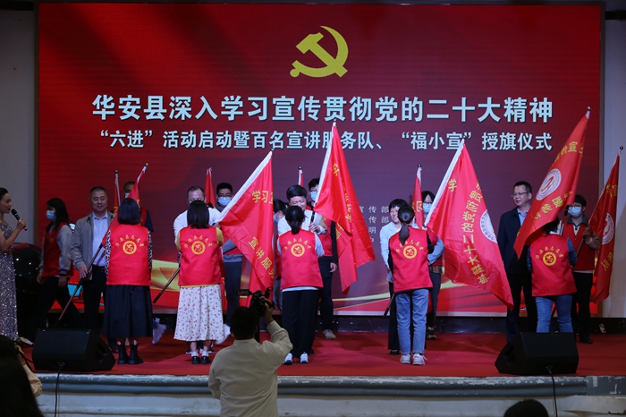 活動(dòng)上,出席活動(dòng)的領(lǐng)導(dǎo)為黨的二十大精神宣講服務(wù)隊(duì)、新思想耀八閩“福小宣”宣講小分隊(duì)授旗。10支“福小宣”宣講小分隊(duì)、百名宣講服務(wù)隊(duì)、縣委宣講團(tuán)、文藝輕騎兵將深入社會(huì),在全縣范圍內(nèi)迅速興起學(xué)習(xí)宣傳貫徹黨的二十大精神熱潮。啟動(dòng)儀式上,福建新華發(fā)行集團(tuán)漳州分公司還向華安捐贈(zèng)了黨的二十大學(xué)習(xí)輔導(dǎo)讀物。