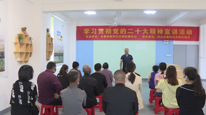 在外山鄉(xiāng)新時(shí)代文明實(shí)踐所內(nèi),林志軍正在和鄉(xiāng)親們宣講黨的二十大精神,結(jié)合群眾身邊的變化,用接地氣的語言表達(dá)方式,和群眾宣傳黨的二十大精神,既通俗易懂,又激勵(lì)人心。林志軍表示,在黨的全面領(lǐng)導(dǎo)下,近年來,他所在的外山鄉(xiāng)不論是基礎(chǔ)設(shè)施建設(shè)還是產(chǎn)業(yè)發(fā)展都取得了顯著的成效,尤其是云峰村,從2017年以前的省級建檔立卡貧困村發(fā)展到現(xiàn)在的“福建省鄉(xiāng)村旅游村”,村民致富,村財(cái)增收,人民群眾的幸福感日益提升,這些都令他深有感觸。作為黨的二十大精神的宣講員,他深感自豪。