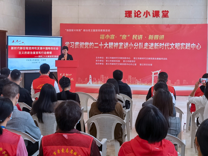 文明風11月11日訊 學習宣傳貫徹黨的二十大精神,是當前和今后一個時期的首要政治任務。為進一步掀起學習黨的二十大精神熱潮,推動習近平新時代中國特色社會主義思想往深里走、往實里走、往心里走,連日來,晉江市充分發(fā)揮新時代文明實踐陣地資源作用,組織開展“福小宣?‘泉’民講?新晉講”黨的二十大精神宣講小分隊走進新時代文明實踐中心(所站)系列活動,深入開展宣傳,迅速掀起學習宣傳貫徹黨的二十大精神熱潮。