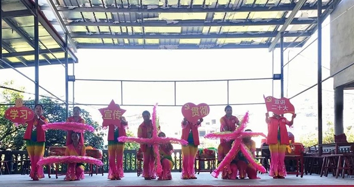 另一側(cè)小廣場上,各支演出隊精心編排的經(jīng)典文藝節(jié)目拉開序幕。巾幗志愿者陳惠萍等人用扇子舞演繹“學習、宣傳、貫徹、二十大”的字樣,動作和諧優(yōu)美,整齊劃一;志愿者陳建明創(chuàng)新宣講形式,將黨的二十大精神轉(zhuǎn)化為生動形象、寓教于樂的快板作品,通俗易懂、朗朗上口的快板把黨的二十大精神融入到日常宣傳中,充分把黨的二十大精神“唱出來”“演出來”“展出來”,成為本次活動的一大亮點。村里書法愛好者現(xiàn)場揮毫潑墨,寫下學習貫徹黨的二十大精神的相關宣傳標語。隨后,趣味性的知識互動“輪番上陣”,贏得現(xiàn)場人員的陣陣掌聲,在寓教于樂中讓黨的二十大精神聲聲入耳、入腦入心,受到大家廣泛好評?!跋襁@樣的活動要經(jīng)常舉行,要學習好、宣傳好、貫徹好黨的二十大精神。”該村老協(xié)會會長、老黨員李春興如說。