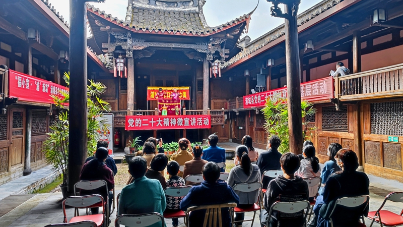 11月20日,在省級(jí)文保單位三山會(huì)館內(nèi),浦城縣新時(shí)代文明實(shí)踐中心“福小宣·‘浦’新篇”宣講隊(duì)的十余名微宣講員通過木偶表演、手鼓表演、詩歌朗誦等文藝表演方式,把黨的二十大的重要意義、奮斗目標(biāo)及浦城的新發(fā)展、新變化等講給現(xiàn)場(chǎng)的觀眾聽。簡潔的語言、活潑的形式,不僅讓觀眾能聽得懂,更能記得住,真正實(shí)現(xiàn)把黨的“好聲音”傳遞到群眾的心坎里。“這次宣講形式很好,寓教于樂,通俗易懂,不僅宣傳了黨的二十大精神,也讓我們更深刻地感受到了祖國和家鄉(xiāng)日新月異的變化?!秉h員蔡心頗有感觸地說,作為一名基層黨員,他將堅(jiān)定不移聽黨話,感黨恩、跟黨走,多為群眾辦實(shí)事、做好事?!拔覀儗⒗^續(xù)深入學(xué)習(xí)領(lǐng)會(huì)黨的二十大精神,同時(shí)借助三山會(huì)館、真德秀坊等文化遺跡,開展形式多樣的宣講活動(dòng),推動(dòng)黨的政策理論在基層落地開花?!焙訛I街道黨委宣傳委員朱若冰表示。