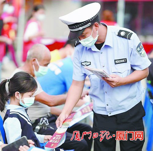在現(xiàn)場(chǎng),警方發(fā)放文明交通宣傳單。(陳嘉新 攝)