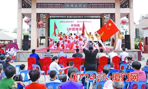 “乘鷺島文明直通車 創(chuàng)全國文明典范城”文明直通車開進(jìn)同安區(qū)五顯鎮(zhèn)垵爐村,精彩節(jié)目輪番上演。(陳嘉新 攝)