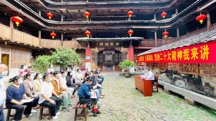 永定區(qū)在土樓客家家訓(xùn)館向游客、土樓居民和鎮(zhèn)村干部宣講黨的二十大精神