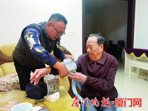 陳加強(qiáng)(左)幫鄰居老人量血壓。(廈門(mén)晚報(bào)記者 戴舒靜 攝)