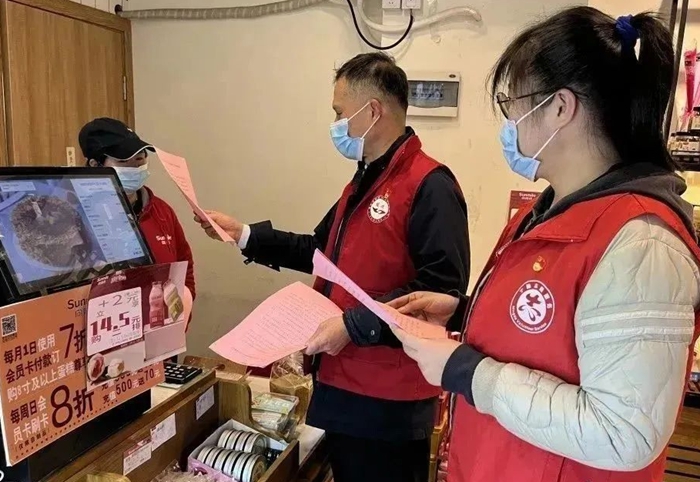 志愿者入商戶發(fā)放宣傳冊并講解說明