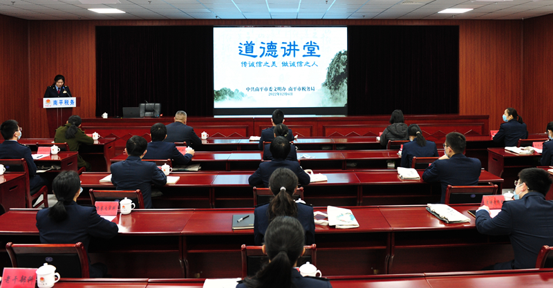 12月6日,為貫徹落實(shí)黨的二十大精神,大力培育和踐行社會(huì)主義核心價(jià)值觀,進(jìn)一步弘揚(yáng)誠(chéng)信文化,提高全民誠(chéng)信意識(shí)和個(gè)人品德建設(shè),由中共南平市委文明辦、市稅務(wù)局聯(lián)合開展,以“傳誠(chéng)信之美,做誠(chéng)信之人”為主題的道德講堂在潭開講。南平市委文明辦、市稅務(wù)局有關(guān)領(lǐng)導(dǎo)及南平市稅務(wù)局各部門40人參加了本次講堂。