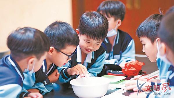 11月30日,在滄江研學營地,精心設計的研學實踐和科普活動將來自新江中心小學等海滄多所學校的近400名學生引入科學的海洋,讓他們學在其間,樂在其中?!坝械镍B類羽毛居然會隨著情緒變色,平時是藍色,一興奮就變紅色!”第一次開了眼界,新江中心小學六年(2)班學生俞秋瑤興奮不已。