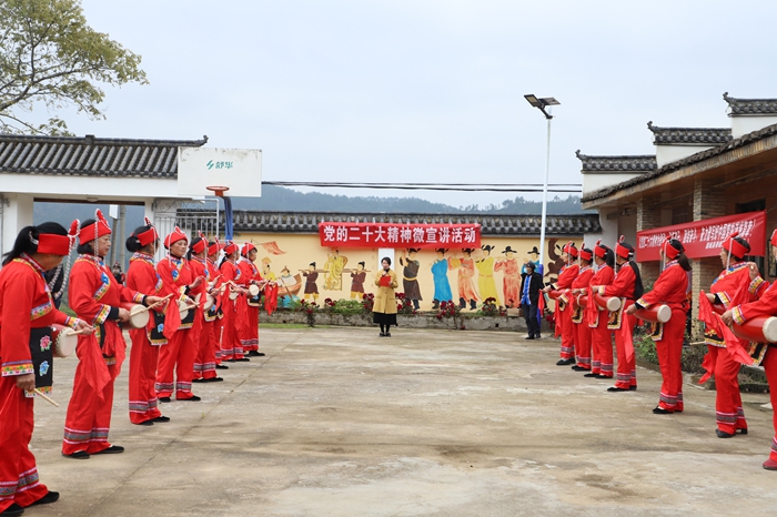 活動現(xiàn)場,富嶺鎮(zhèn)6名微宣講員們用熱忱的言語、催人奮進的聲音,表演了《黨的二十大之歌》詩歌朗誦;一位畬族村民用漢畬雙語講述了這些年來發(fā)生在身邊的變化,并用飽含深情的“畬音”唱響了贊美美好生活的畬族民歌;20名畬族婦女身著盛裝,為大家?guī)砹俗顬閭鹘y(tǒng)、質(zhì)樸而熱烈的腰鼓表演,隆隆鼓點激發(fā)了奮進的腳步。