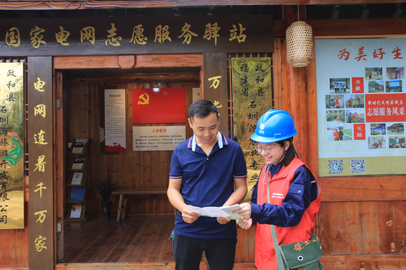 國(guó)家電網(wǎng)福建電力“雙滿意”(政和)共產(chǎn)黨員服務(wù)隊(duì)成員為往來群眾宣傳用電安全知識(shí)。吳禮蕓 攝