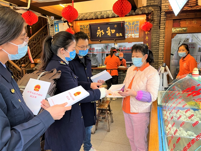 鼓樓區(qū)市場監(jiān)督管理局的工作人員發(fā)放宣傳手冊(鼓樓區(qū)委文明辦供圖)