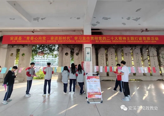 近日,由共青團安溪縣委員會、縣委文明辦等單位聯(lián)合舉辦的“青春心向黨?奮進新時代”學習宣傳貫徹黨的二十大精神主題燈謎競猜活動在安溪茶校開展。