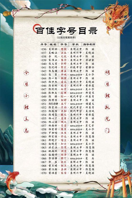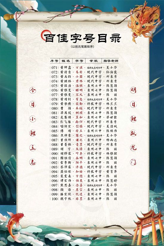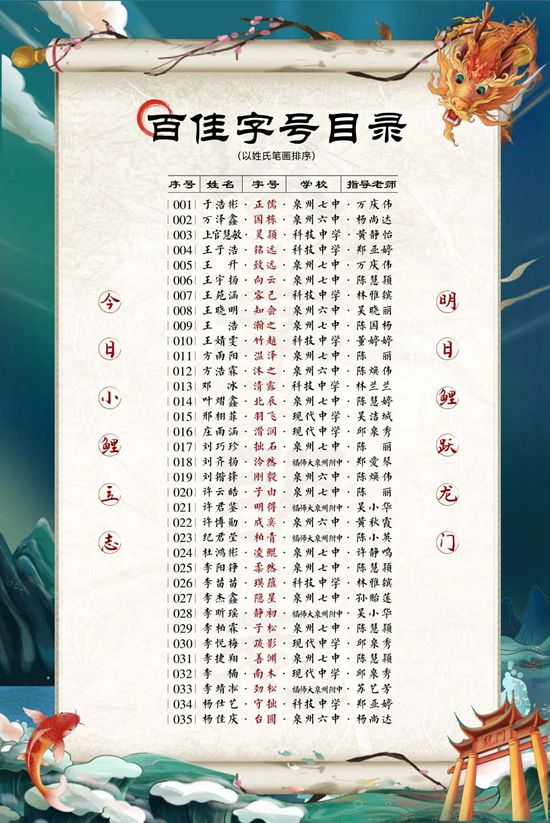 據(jù)悉,此次活動由鯉城區(qū)委宣傳部、鯉城區(qū)委文明辦、鯉城區(qū)教育局、鯉城團區(qū)委、鯉城區(qū)社科聯(lián)共同主辦,于今年9月正式啟動,學(xué)生在老師和家長的指導(dǎo)下,通過查閱資料、請教老師等方式,為自己取“字”,從中汲取中華優(yōu)秀傳統(tǒng)文化的力量,以“字”明志,堅定人生理想?;顒庸参巳珔^(qū)中學(xué)生2820人參與。