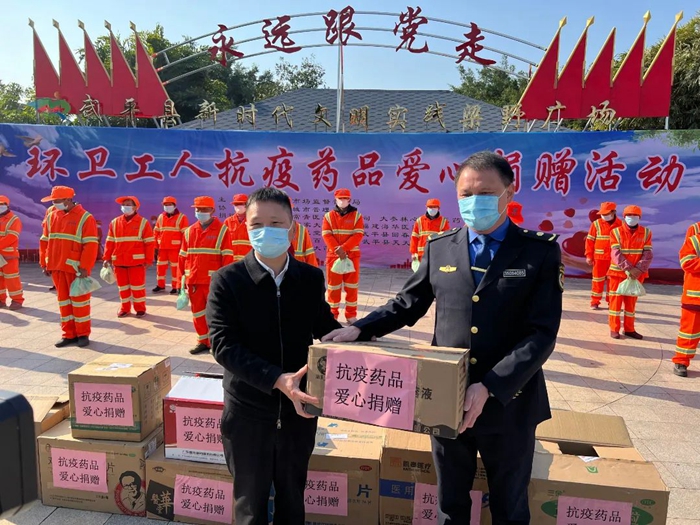 在活動現(xiàn)場,各藥企負(fù)責(zé)人和工作人員將醫(yī)用口罩、感冒清熱軟膠囊、布洛芬、板藍(lán)根顆粒、酒精等防疫物資逐一發(fā)放到環(huán)衛(wèi)工人手中,叮囑他們在工作中注意安全作業(yè),以健康的身體在平凡崗位上做出更大的貢獻(xiàn)。